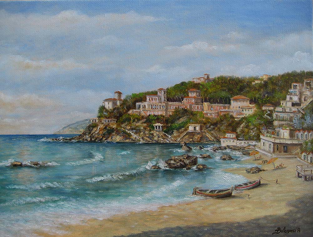 Bolognesi ci dona attraverso una interpretazione lirica della vita campestre con i suoi congeniali paesaggi,dove la luce cristallina decompone le forme ,modella i volumi, plasma la materia, le scene che ne vengono fuori sanno di buono,di fresco, di pulito.